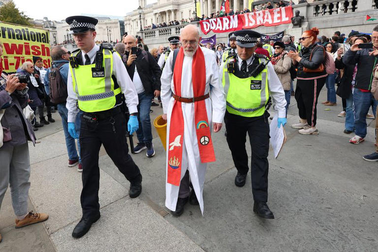 واحتشد مئات للمشاركة في الاحتجاج بوسط لندن حيث بدأت الشرطة في إبعاد بعضهم دون مقاومة وسط تصفيق وهتاف للمحتجزين. وهتف البعض “عار عليكم” في وجه أفراد الشرطة.