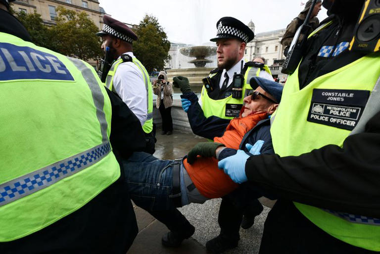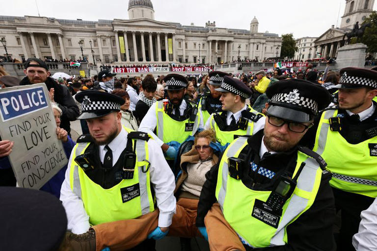 وألقت الشرطة القبض على المحتجين في ساحة الطرف الأغر بوسط لندن بعد رفعهم لافتات حملت شعارات مؤيدة لحركة (فلسطين أكشن) التي جرى حظرها في يوليو تموز بعد أن اقتحم أعضاؤها قاعدة جوية وألحقوا أضرارا بطائرات عسكرية.